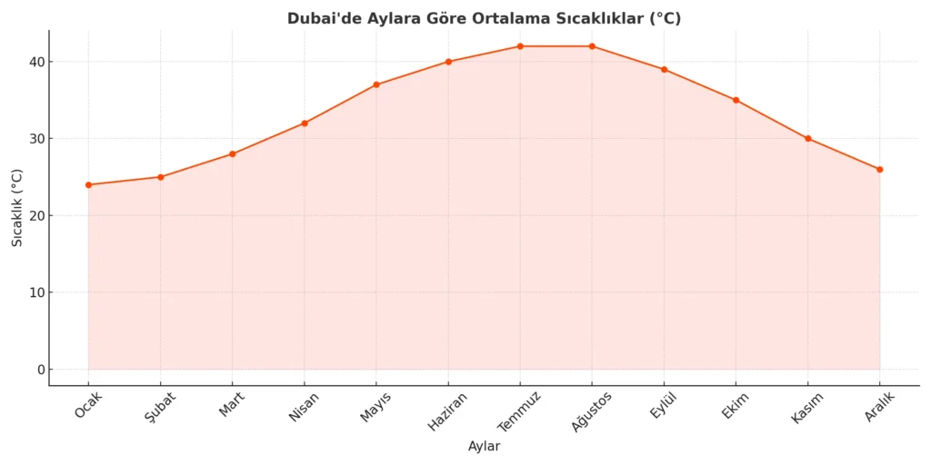Dubai’de yaz ayları sadece sıcak değil, aynı zamanda yüksek nemle de birleşir. İşte ortalama aylık sıcaklık verileri: